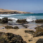 Ganz an der Südspitze der Insel, zwischen der Punta de Jandía und der Punta Pesebre, liegt der Strand Playa de los Ojos. Feiner, hellgelber Sand. Ein ovaler Basaltfelsen, fast mittig in der Bucht. Bei Flut reicht der Atlantik bis an die Steilküste, bei Ebbe gibt das Meer glatt geschliffene Felsformationen frei. Ringsum: Riffe, Wellen, Einsamkeit. Schwimmen ist auch hier wegen gefährlicher Strömungen nicht ratsam. Wer kommt, verbindet den Besuch mit dem Faro de Jandía und der farbenprächtigen Caleta de la Madera – eine Rundwanderung von rund 11 Kilometern, die an der äußersten Westspitze Fuerteventuras entlangführt.